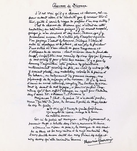 « (…) On n’oublie plus l’ampleur superbe d’un paysage d’avant les hommes, dialogue d’éternité entre la montagne et la plaine ; et non plus la fraîcheur d’une vallée où l’eau chante sa pure transparence et l’allégresse de sa course : chant sirénien venu du fond des temps, irrésistible aux nomades des vieux âges qui les premiers se sont arrêtés là pour y bâtir leur maison. Il ya pour les hommes d’aujourd’hui cette présence des générations milénairement accordées au site, où croît des arbres qu’elles avaient plantés, aux modulations colorées de la prairie et du labour, au balancement des gramens sauvages, aux pépiements de la mésange et du moineau. Il y a les amis d’année en année retrouvés, complices d’un bonheur de vivre dont ils savent le mot de passe, si familier au fond d’eux-même qu’il leur suffit d’échanger un regard pour l’entendre sans l’avoir dit : « Divonne? Divonne? (…) »