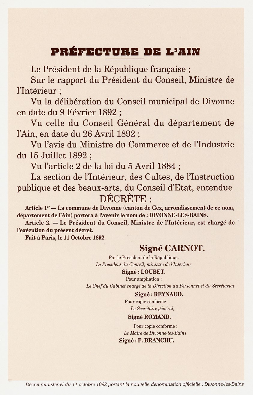 La commune de Divonne a acquis officiellement la dénomination « Divonne-les-Bains » en 1892, par un décret ministériel signé par le président de la République Sadi Carnot. C’était déjà devenu une habitude pour les baigneurs (comme on appelait alors les curistes) et même pour les Divonnais de dire « Divonne-les-Bains ». C’est pourquoi le Conseil Municipal, présidé par le maire, Ferdinand Branchu, dans sa séance du 9 février 1892 a demandé à l’unanimité que le nom de Divonne-les-Bains soit attribué à la commune.