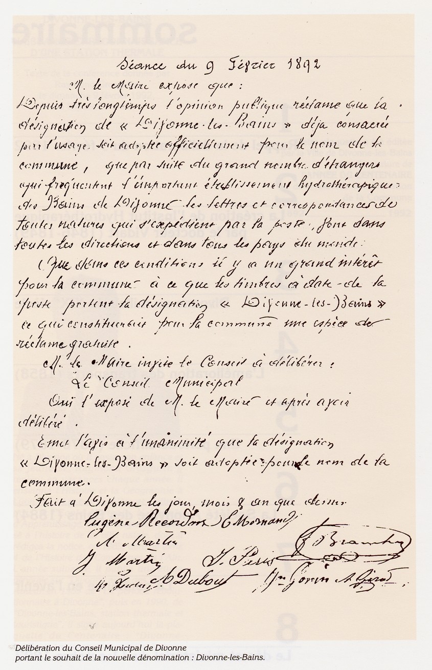 On trouvera ci-dessous le compte-rendu de la délibération, tel qu’il figure dans les archives de la mairie de Divonne-les-Bains, ainsi que le décret ministériel du 11 octobre 1892, selon lequel « la section de l’Intérieur, des Cultes, de l’Instruction publique, des beaux-arts, du Conseil d’Etat » a décrété que la commune de Divonne portera à l’avenir le nom de « Divonne-les-Bains ».