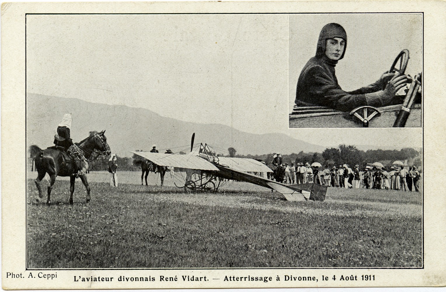 René Vidart, sur son monoplan Deperdussin, venait de Plan-les-Ouates, commune du Canton de Genève, où se déroulait, du 3 au 7 août 1911, un grand meeting d’aviation dont il fut le héros. Voir sur le site www.pionnair-ge.ch, le site des pionniers de l’aviation à Genève, la page : Premier gigantesque meeting populaire du canton, à Plan-les-Ouates, en plein été 1911