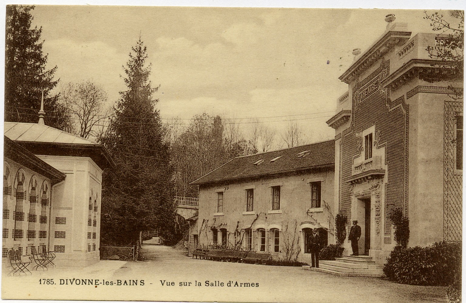 « L’établissement est situé au centre d’un très beau parc de cinq à six hectares, où jaillissent quatre sources abondantes, dont les eaux se jettent dans la Divonne ou Versoix. Les bains sont depuis le mois de novembre 1884 la propriété d’une société anonyme. La nouvelle administration y a apporté de grands changements et en a fait un établissement modèle, qui dépasse tout ce qu’il y a de plus complet en ce genre.