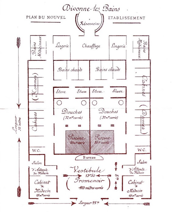 Et ci-dessous le plan de l’établissement de bains dessiné par le docteur Edouard Vidart dans sa brochure « Divonne-les-Bains – Hydrothérapie – Renseignements généraux sur l’établissement et sur les procédés thérapeutiques employés à Divonne par le Dr E. Vidart, médecin en chef de l’établissement, Ancien externe des Hôpitaux de Paris, Membre correspondant de la Société de Médecine Pratique de Paris – Genève – Imprimerie Haussmann et Zoellner – Rue du Mont-Blanc 1897 ».