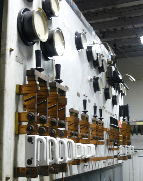 Ci-contre le tableau de distribution en marbre avec les manettes. Il dispatchait le courant vers les hôtels de la Société des Bains.