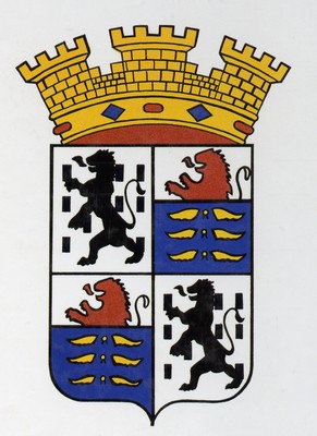 L’écu est sommé d’une couronne murale à trois tours d’or, maçonnées de sable.