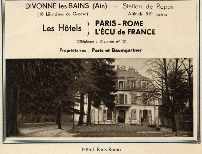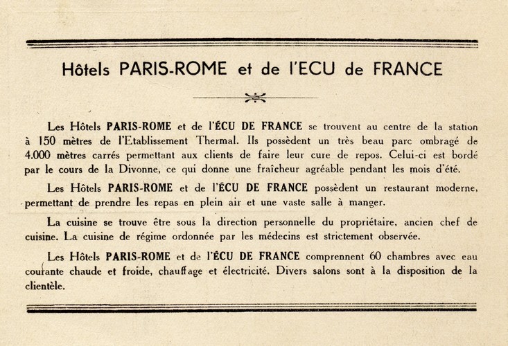 Le 28 février 1924, Marie Bernard vendit la villa pour 165.000 francs à Marguerite, Hélène et Charles Paris, frère et soeurs, déjà propriétaires de l’hôtel-restaurant l’Ecu de France situé dans la même rue, de l’autre côté du parc et renommé pour son excellente cuisine. La villa Paris-Rome devint une annexe de l’Ecu de France. Dès lors on put voir des annonces comme celle-ci: