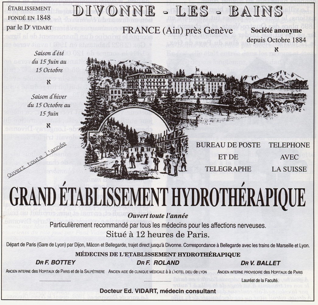 1913 : Le nouveau « prospectus médical illustré » annonce quatre médecins aux thermes (Bottey, Ballet, Ballivet et Vieux) et deux « médecins consultants » : Vidart et Roland.