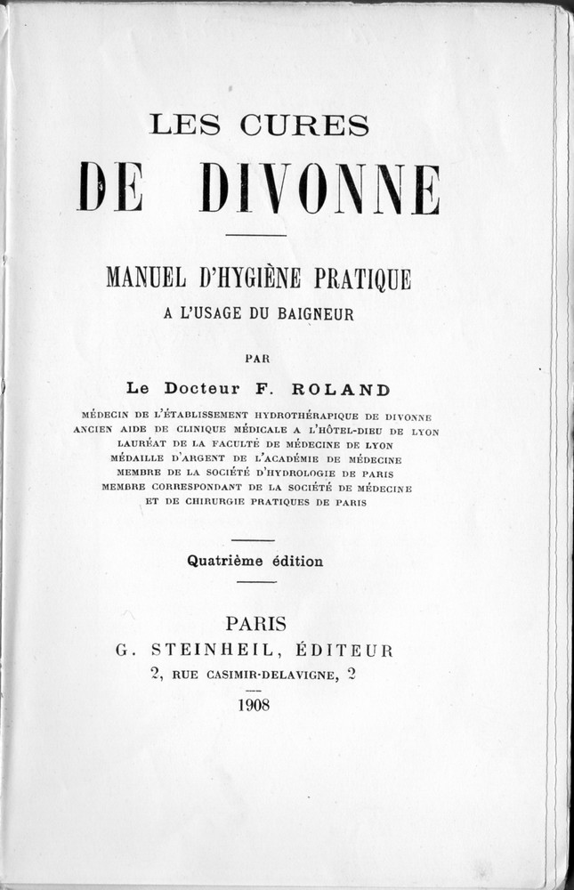 On peut lire sur Gallica le livre du Docteur François Roland Les cures de Divonne, manuel d’hygiène pratique à l’usage du baigneur, Paris G. Steinheil éditeur, 1897. Nous proposons ici des extraits de la 4e édition (1908).