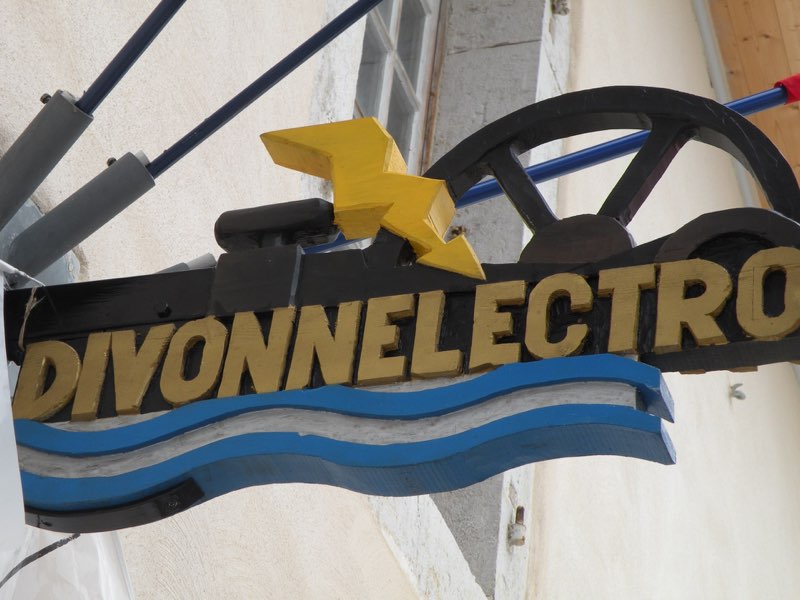L’enseigne de Divonnelectro, à l’entrée du Moulin David, 1 place des 4 Vents,