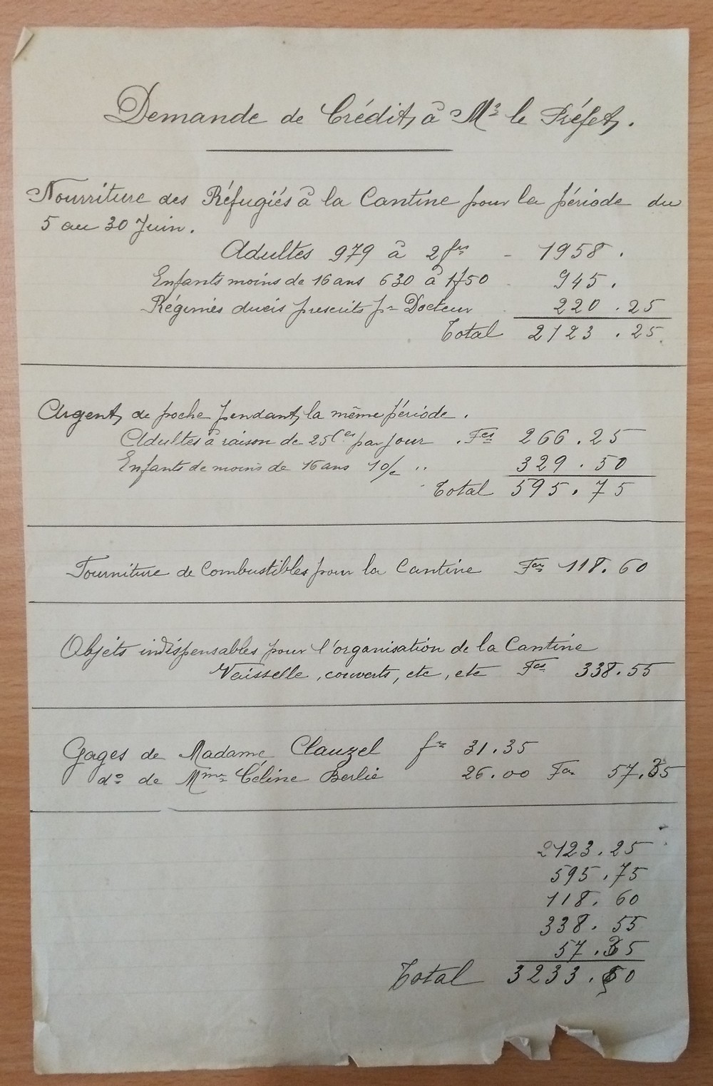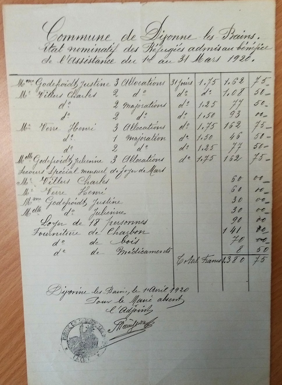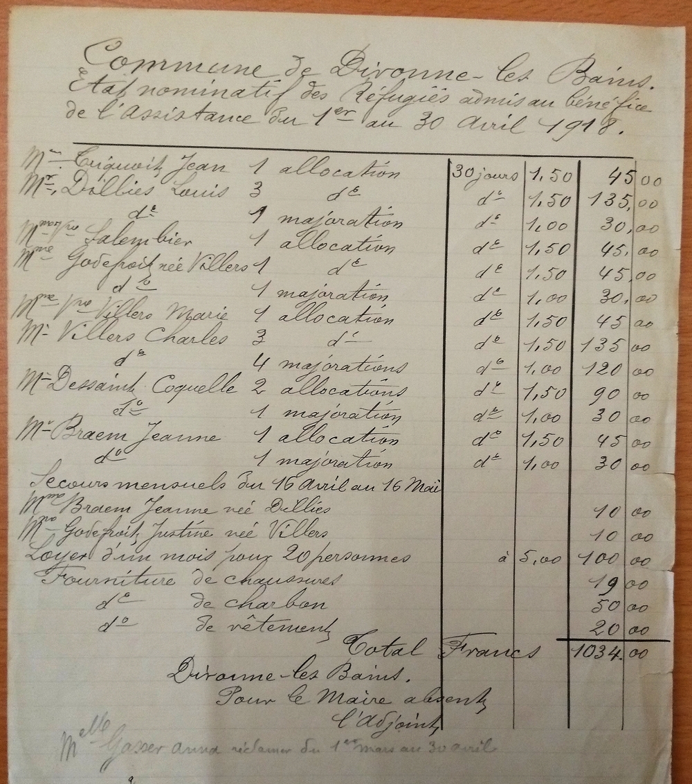 Les logeurs étaient indemnisés. La mairie a créé et géré une cantine, dont elle rétribuait le personnel. Elle se faisait rembourser les dépenses par le Préfet. Les réfugiés percevaient une allocation au taux journalier de 1.50 Franc, avec majoration selon le nombre d’enfants. En 1920 : adultes 1,75 par jour – enfant 1,60 par jour. Pour les secrétaires de mairie la tenue de cette comptabilité représentait un travail colossal qui s’ajoutait à la lourde tâche du ravitaillement et à la comptabilité des allocations journalières et aides aux résidents (secours de loyer, secours de foyer, vieillards, veuves de guerre, familles nombreuses, frais d’assistance médicale ou hospitalière). De plus, la ville de Divonne envoyait des dons pour soutenir des communes du nord. Elle aidait financièrement les Divonnais prisonniers en Allemagne. Tant et si bien qu’en septembre 1918, l’association des secrétaires de mairie du département de l’Ain a adressé un mémorandum au Préfet pour se plaindre « du surcroît de travail qui se déverse de plus en plus sur les mairies » et réclamer « un salaire plus en raison du travail compliqué dans la zone ».