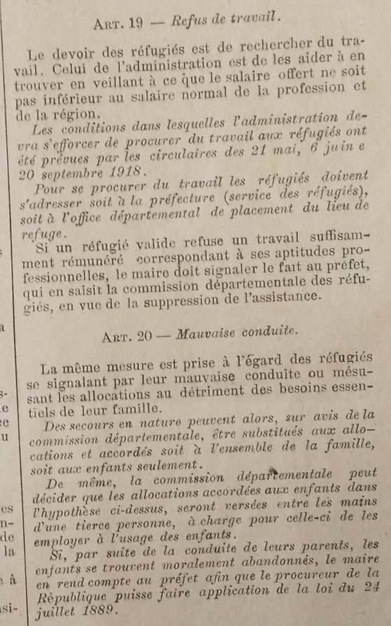 Les réfugiés devaient rechercher du travail. S’il refusaient un emploi, on leur refusait l’allocation. En cas de mauvaise conduite, on leur coupait l’allocation. Le maire devait veiller à ce que des enfants ne soient pas abandonnés à cause de la mauvaise conduite de leurs parents, comme le montrent les articles 19 et 20 du Régime des Réfugiés :