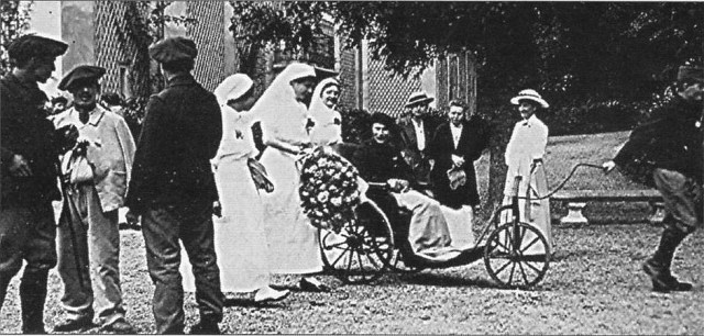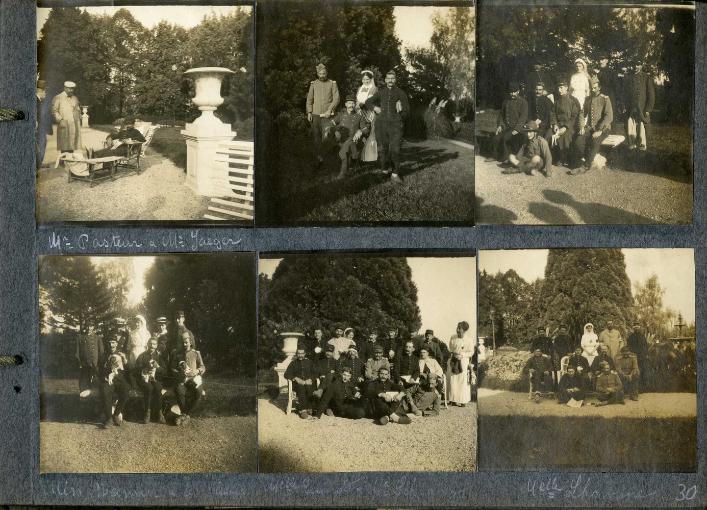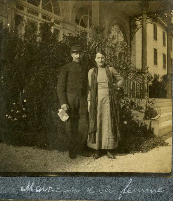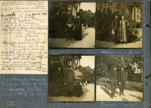On reconnait sur la photo la marquise du Grand Hôtel. ARPADI a recherché qui étaient les soldats sur ce document de la Bibliothèque de Genève. Elle a trouvé que le soldat Paul Moineau, photographié avec son épouse à sa sortie de l’hôpital militaire de Divonne en septembre 1914 est mort au Champ d’Honneur le 11 mai 1915 à Neuville-Saint-Vaast.