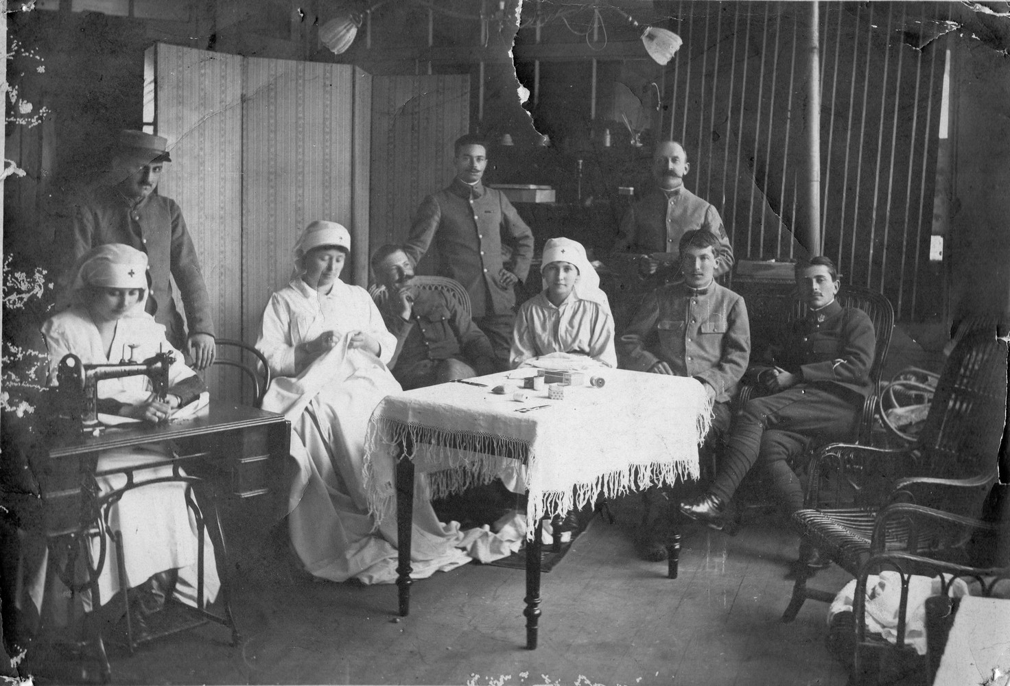 Le Divonnais Georges Jacquet nous a transmis cette photo de l’infirmerie située dans la vieille maison. Atelier de couture. Les soldats venaient se distraire auprès des infirmières entre les soins. Une infirmière est madame Fague, une autre est la tante de Georges, une demoiselle Burnet. Georges raconte : « Elle a connu un soldat du nord, Albert Razet, caporal mitrailleur. Il était trombone de division. Il sortait du conservatoire de Valenciennes. Il a été blessé à la mâchoire. Ils l’ont retapé et il l’ont envoyé se battre dans les Balkans avec les Serbes et les monténégrins contre les troupes autrichiennes. Il lui écrivait des lettres. Il disait qu’ il était content de manger des tomates pour se passer la soif… »