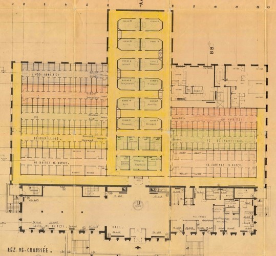 Rez-de-chaussée. Secteur des dames, à gauche : il comptait 120 cabines de déshabillage (Oui! 120!) + 4 étuves + 4 WC + 14 cabines repos + 4 cabines de massages.
