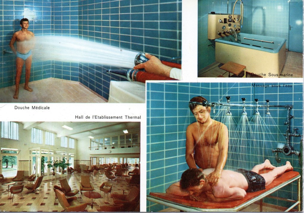 Les huit médecins thermaux appliquaient eux-mêmes les douches. Chacun avait sa propre cabine de douche au rez-de-chaussée et son propre cabinet au 1er étage. Au rez-de-chaussée, après le vaste hall d’accueil, les curistes pénétraient dans l’espace de soins, les dames à gauche, les messieurs à droite.