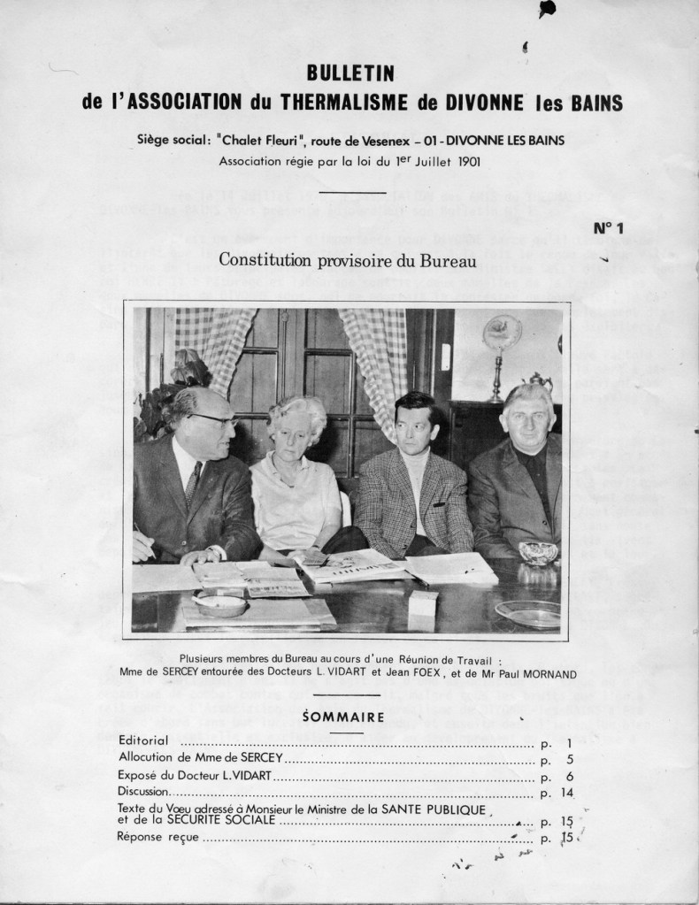Pour enrayer la baisse du nombre de curistes, une Divonnaise, Madame de Sarcey a fondé en 1970 l’association des Amis du Thermalisme de Divonne-les-Bains, avec le docteur Lionel Vidart. Cette association éditait un bulletin et s’efforçait de conseiller la municipalité et les commerçants divonnais pour qu’ils améliorent l’accueil des curistes et leur tranquillité, par exemple en créant des rues piétonnes.