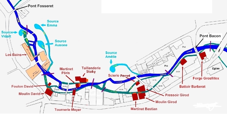 Les indications de l’ordre de service des Ponts et Chaussées de 1857 correspondent au « plan des usines le long de la rivière en 1861 » dans Divonne au fil des siècles de Raymond Grosgurin, page 222-223.