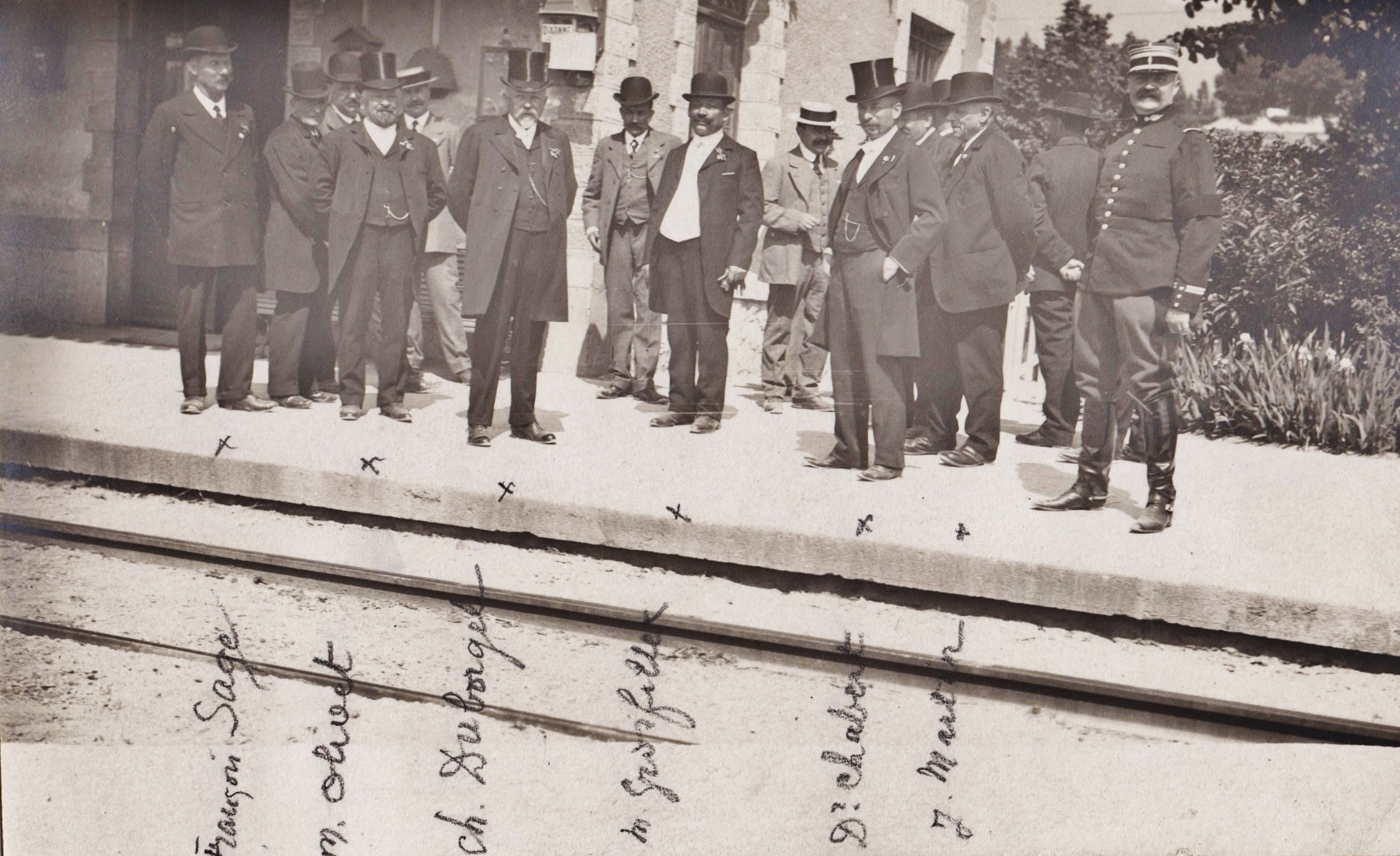 Le dimanche 11 juin, par grand beau temps, un train à vapeur de huit wagons de luxe passait à Gex sans s’arrêter. Il amenait à Divonne Monsieur Monestier, ministre des travaux publics et monsieur Mougeot, sous-secrétaire d’état aux Postes et Télégraphes, accompagnés de députés, sénateurs et conseillers généraux, y compris de Haute-Savoie. Ils commençaient leur tournée inaugurale par Divonne où ils étaient invités, conjointement par la mairie et la Société des Bains, à un banquet au Grand Hôtel des Bains (truites de Divonne et beignets de Divonne, entre autres). A l’arrivée du train, la fanfare l’Echo de Mussy a joué la Marseillaise et les pompiers ont formé une haie d’honneur aux officiels. Les rues, fenêtres, fontaines étaient décorées de guirlandes de fleurs et de drapeaux tricolores. Le notaire Monsieur Girod avait même construit devant son étude un petit train en bois avec locomotive. Le ministre s’est extasié sur le beau paysage gessien. Il faut dire que de Gex à Divonne, les talus avaient été décorés de marguerites et de coquelicots.