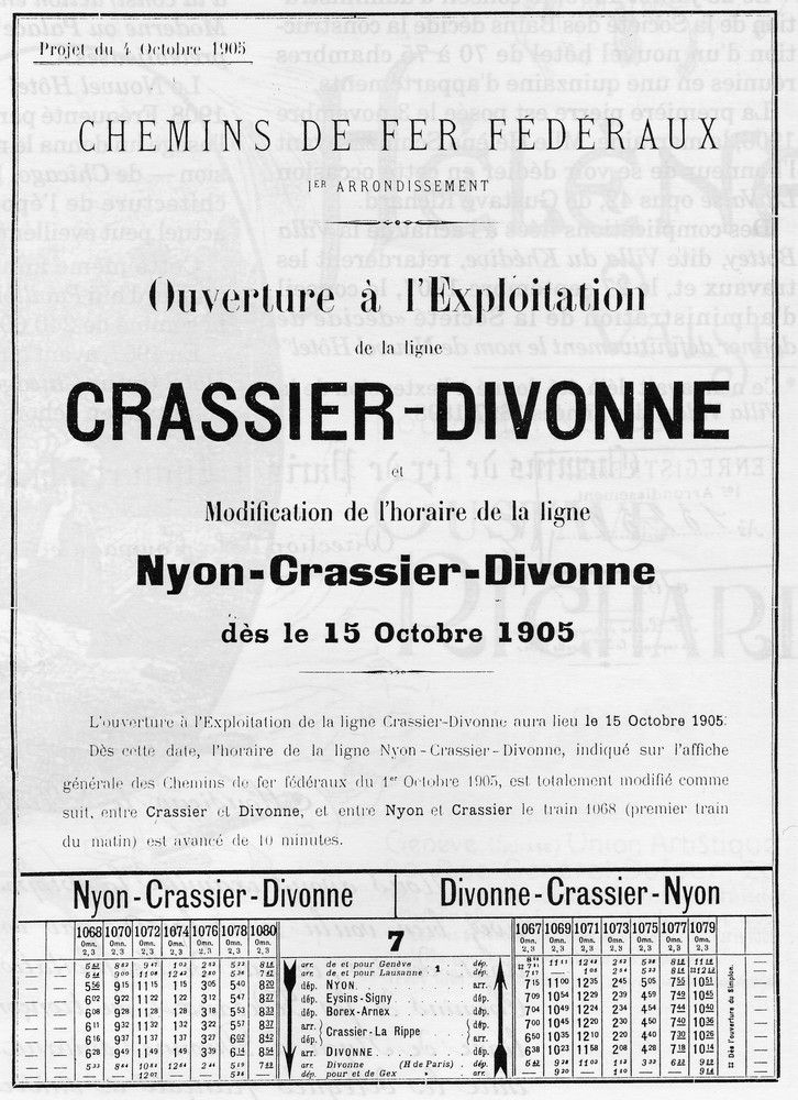 Déclaration d’utilité publique le 24 juillet 1903 de l’établissement d’un chemin de fer de Divonne-les-Bains à la frontière suisse vers Crassier. Signature d’une convention le 9 août 1904 entre la France et la Suisse. Création de la Compagnie Nyon-Crassier pour exploiter la ligne. Le 1er mai 1905, mise en service du tronçon Nyon–Crassier. Le 3 novembre 1905 mise en service du tronçon Crassier–Divonne. Fermeture de la ligne Nyon-Divonne le 29 septembre 1962, à l’époque où se construisait l’autoroute Genève-Lausanne.