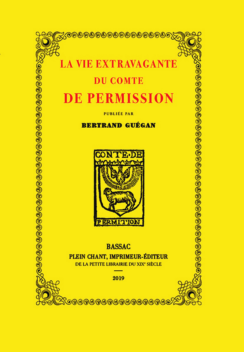 Nous recommandons absolument le livre de Bertrand Guégand La vie extravagante du comte de Permission, publié en 1924 et réédité en 2019 aux éditions Plein Chant, dans la collection Gens singuliers. Le livre se base sur les écrits de Bluet et comporte une notice explicative et un appendice, qui nous éclairent sur sa fin de vie et sur l’époque. Il est illustré de petites gravures sur bois, comme l’édition originale de 1924.