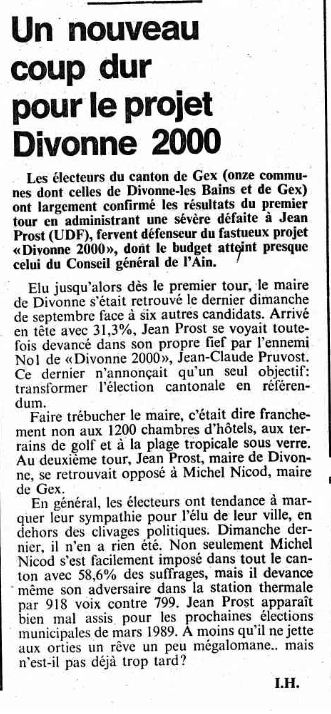 Le maire, Jean Prost, a perdu des plumes dans cette histoire. D’abord sa place de Conseiller Général aux élections de 1988. Puis sa place de maire en 1989.