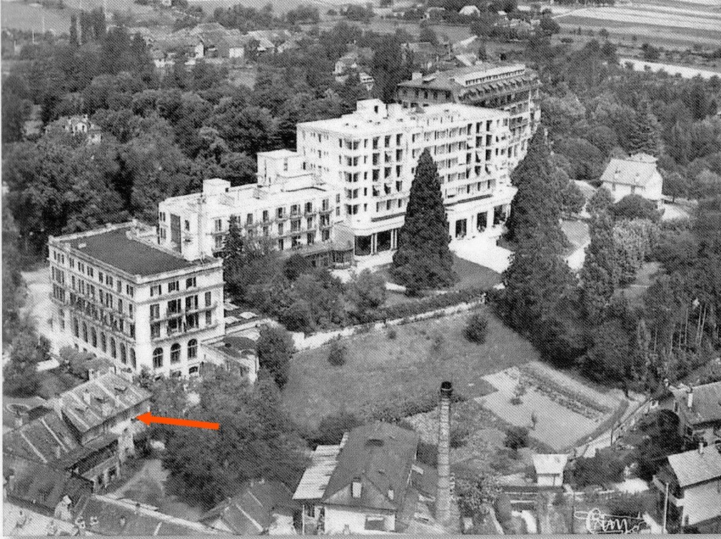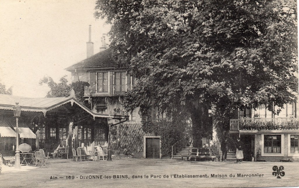 Bref ! Notre gentille maison avait son marronnier à elle, rien qu’à elle. Ils s’enlaçaient. Ils étaient heureux. Ils ont voisiné quelques temps avec « la cage à mouches », un étrange restaurant vitré, mi-chalet, mi-pergola où les baigneurs venaient s’affaler pour faire leur réaction après les soins thermaux.