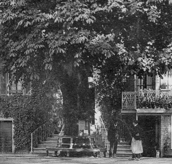 Bref ! Notre gentille maison avait son marronnier à elle, rien qu’à elle. Ils s’enlaçaient. Ils étaient heureux. Ils ont voisiné quelques temps avec « la cage à mouches », un étrange restaurant vitré, mi-chalet, mi-pergola où les baigneurs venaient s’affaler pour faire leur réaction après les soins thermaux.