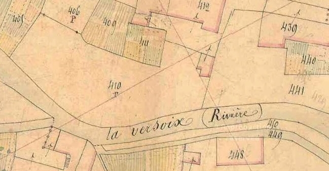 6 – Le vrai nom de la rivière qui traverse Divonne est la Versoix, comme l’attestent les cartes anciennes, et même certains documents officiels actuels. Ci-contre le cadastre « napoléonien ».